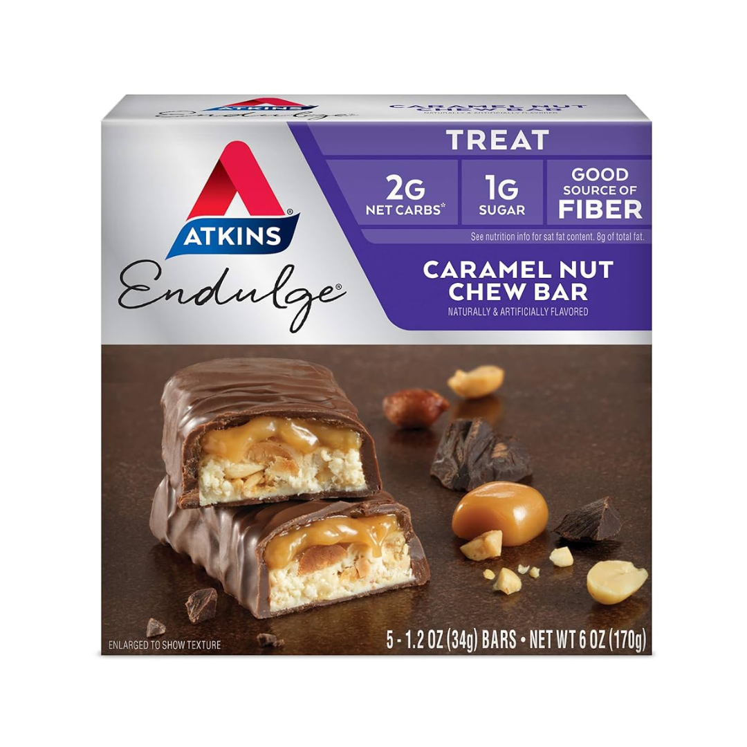 Atkins Endulge Caramel Nut Chew Bar combines creamy caramel, crunchy nuts, and smooth chocolate. A guilt-free treat that fits perfectly into low-carb diets.