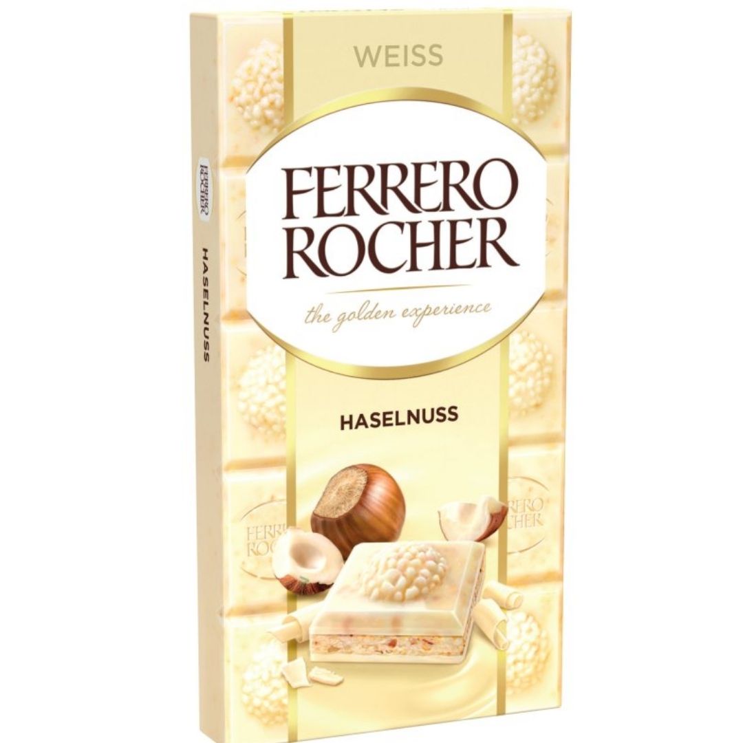 Chocolate bar with the taste of Ferrero Rocher: Delicious hazelnut cream, coated in a fine white chocolate coating, and crunchy hazelnut pieces invite you to enjoy