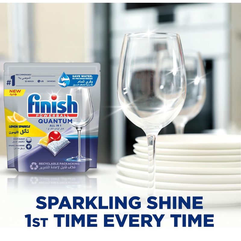 Experience superior dishwashing performance with Finish Powerball Quantum Dishwasher Detergent Lemon Sparkle,416g(40Tabs). Each tablet features advanced Powerball technology that cuts through grease, breaks down tough food residues, and removes stains even from baked-on dishes. The lemon sparkle fragrance keeps your dishwasher smelling fresh, while the built-in shine booster leaves your glassware spotless. Designed for all types of dishwashers, Finish Quantum ensures a professional-level clean every time. Shop now on Hylomart.com for genuine Finish products with fast delivery across the UAE.